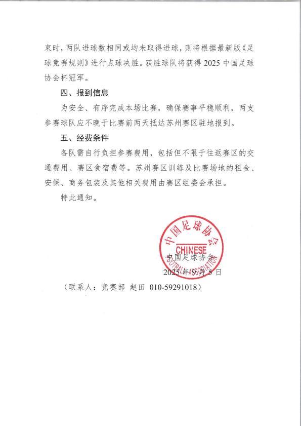 9月5日,中国足协杯官方消息,本年度的足协杯决赛定在12月6日晚进行。官方文件显示,足协杯比赛地点仍为苏州奥体中心体育场,场序上的主队是北京国安,客队是河南队。比赛时间从之前的12月5日改成了12月6日,这是一个星期六,也方便了两队的球迷奔赴苏州观看比赛。决赛采用90分钟+加时赛+点球大战的方式决出胜负。...