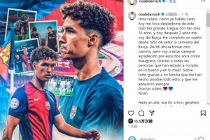 达维希社媒发文告别巴萨,他写道:“大家好,巴萨球迷们!如你们所见,今天是我向这家伟大的俱乐部告别的日子。我16岁时来到这里,如今两年后我将离开巴萨。