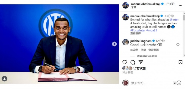 阿坎吉在社媒中写道:“无比期待在国米展开的新征程。这不仅是一个全新的起点,更是一次重大挑战,我很荣幸能加入这个值得称之为家的传奇俱乐部!”并配发了签约现场图片。